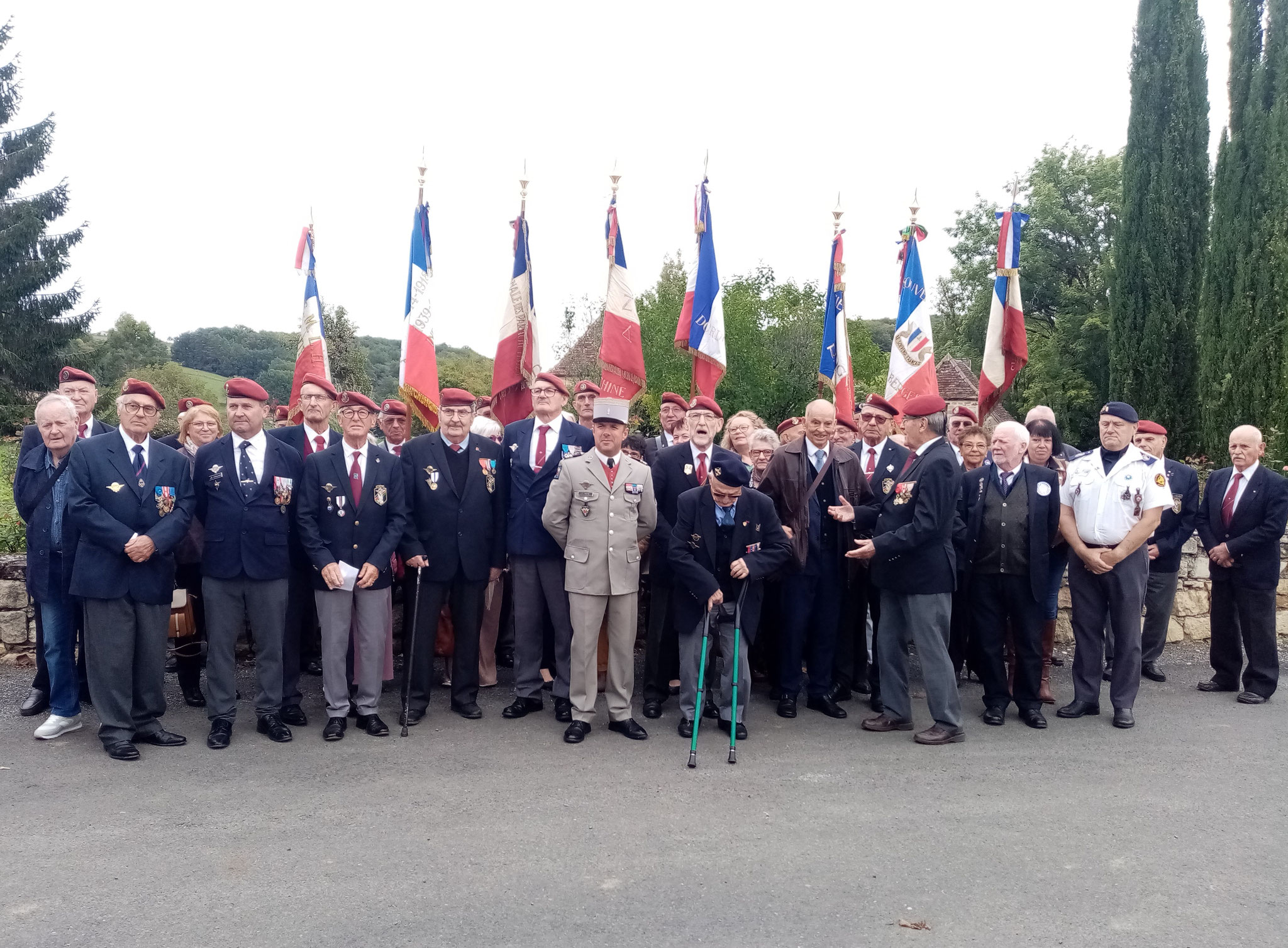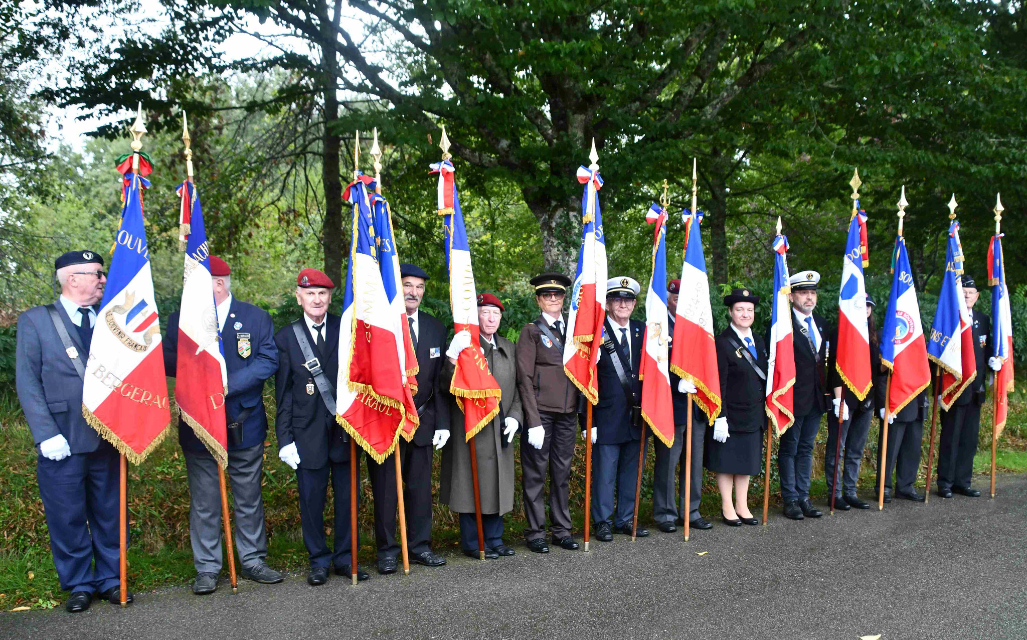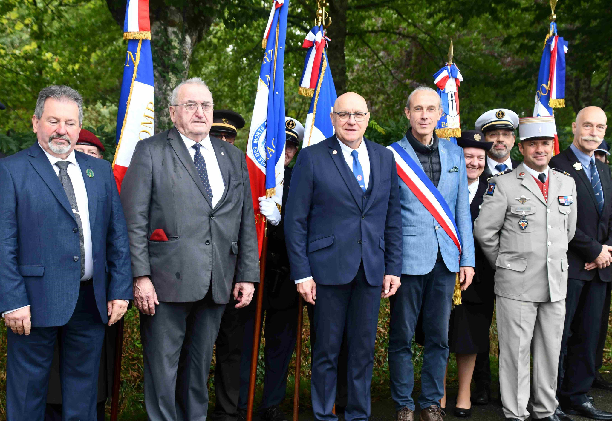 5 - Les autorité et les organisateurs devant les 20 porte-drapeaux. De gauche à droite François de Madaillan, VP du comité de Bergerac, le colonel Heyraud, DG 24, le lieutenant-colonel Roche, DMD 24, Serge Muller, député du Bergeracois, Roland Fray, maire de Saint-Sauveur, Philippe Bories et Frédéric Gontier président du comité de Bergerac.