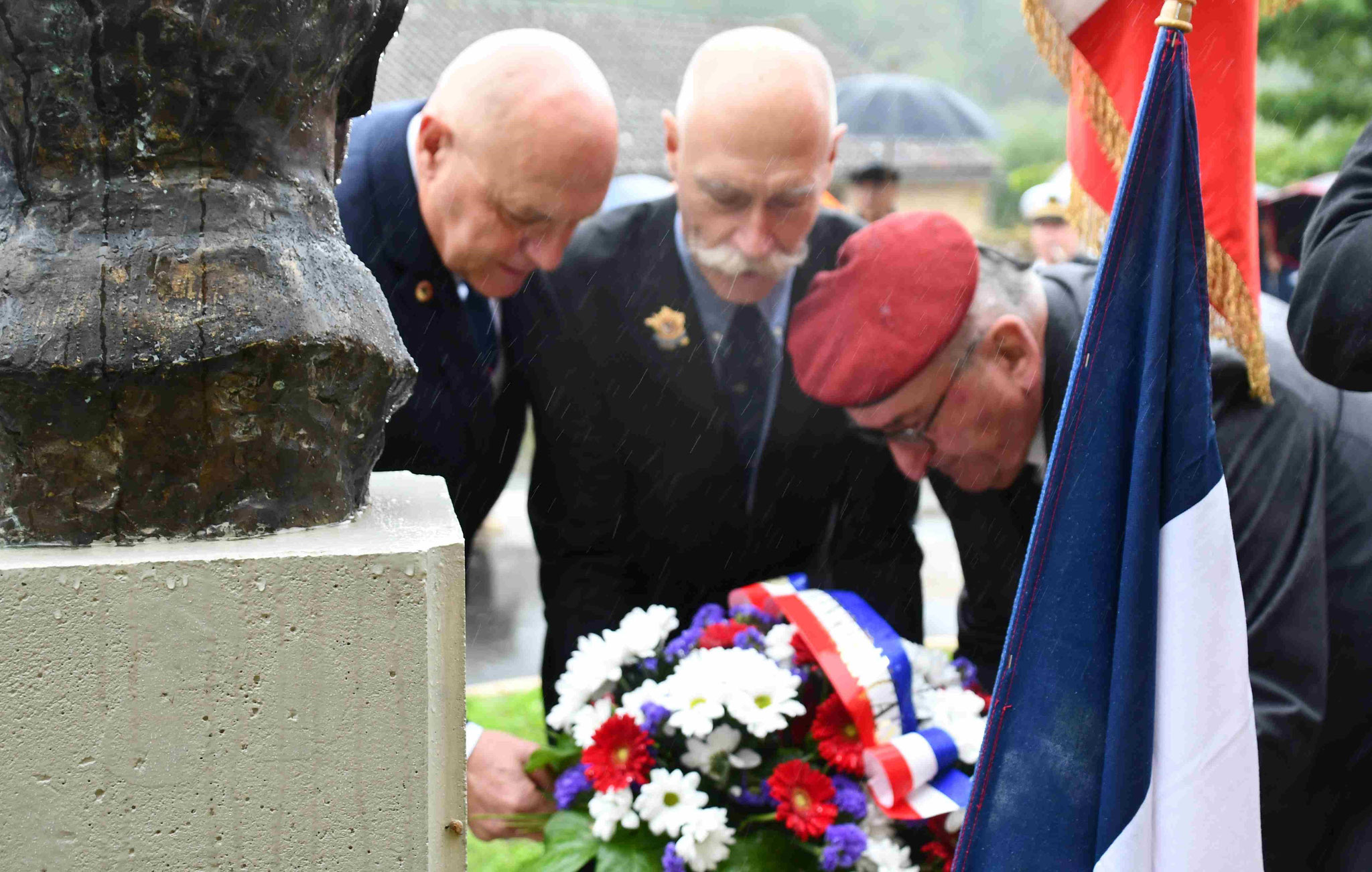 4 - Dépôt de gerbe par le Souvenir Français : J-Marc Chastanet (SF Périgueux), le colonel Heyraud (DG 24) et Frédéric Gontier (SF Bergerac).