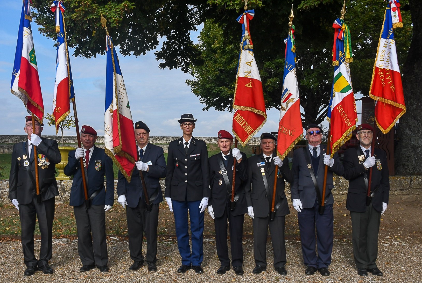 7 - Les autorités devant les 13 drapeaux. De gauche à droite : Christel Defoulny et Eric Fretillère, conseillers départementaux ; Thierry Boidé, président de la CDC Montaigne, Montravel et Gurçon ; Didier Fourcaud, maire de Saint Vivien, Frédéric Carre sous-préfet de Bergerac ; Serge Muller, député ; Serge Mérillou, sénateur ; le commandant Cyril Marie Gibiot (compagnie de gendarmerie de Bergerac) ; le major Bloy (commandant la brigade de Vélines).