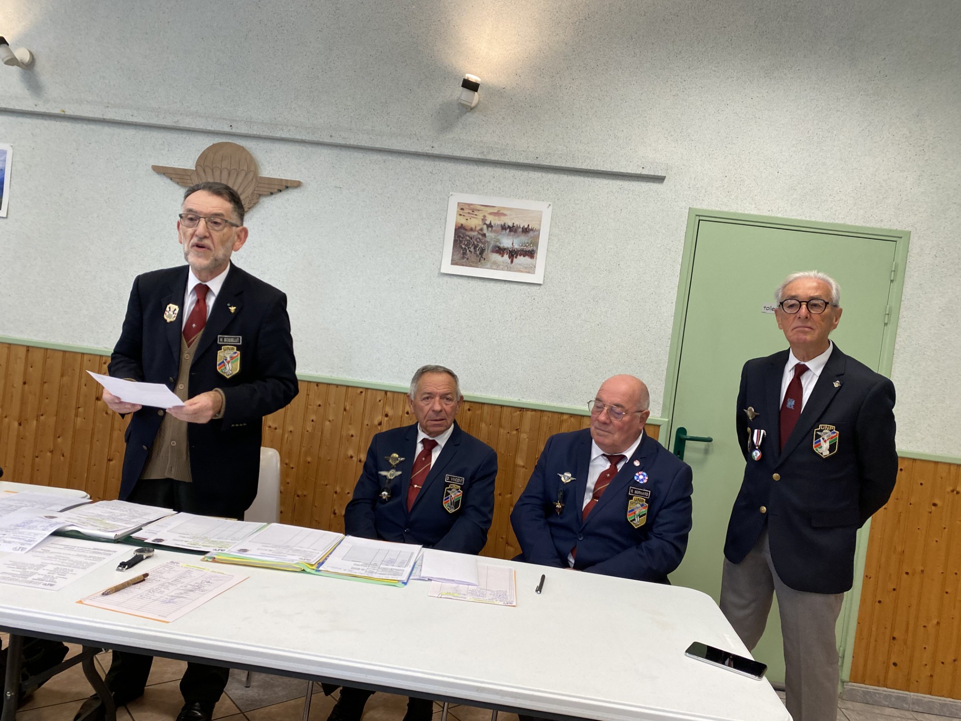 2 - Le président Michel Bosselut exposant le bilan moral de l’association, avec, à sa gauche René Bernard (porte-drapeau), Daniel Vincent (secrétaire) et Bernard Malbaux (membre du bureau).